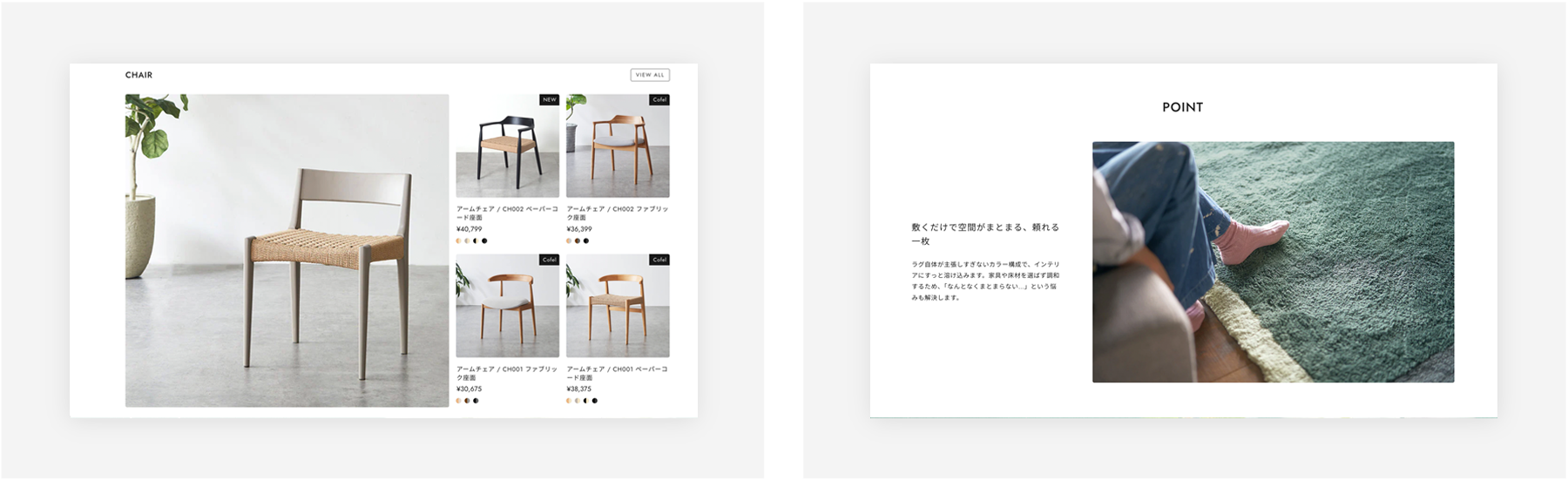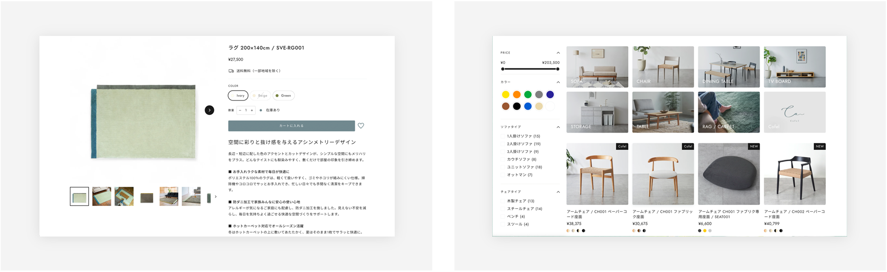 商品ごとに異なる配送日の設定や、ジャーナルから商品を選べる関連商品の表示など、サイトにもユーザーに配慮した"快適さ"を”感じる”設計となっています。